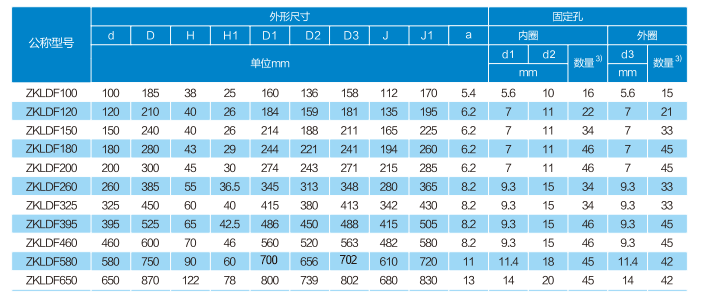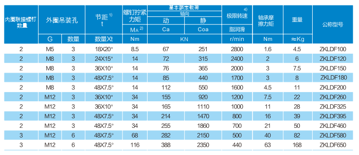 ZKLDF推力角接触球系列转台轴承使用复合钡基脂润滑,亦可通过外圈上的油孔再润滑。